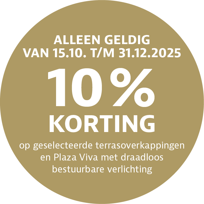 • 10 % korting op uw glazen terrasdak Terrazza Pure, Terrazza Sempra of Terrazza Originale of uw pergolazonwering Plaza Viva inclusief lichtlijst, handzender en ontvanger